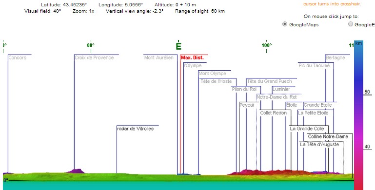 Ci-dessous l’angle de vision d’un grand angle à partir d’un point fictif à 200m d’altitude, à Aix-en-Provence, vers le sud ; en théorie, aux extrémités, on peut donc voir à la fois un bout de la chaîne de la Nerthe et de la Sainte-Baume.
