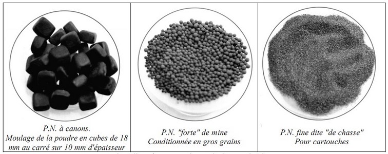 Jusqu’au XVIIe siècle, malgré les soins apportés à sa fabrication, la poudre noire n’était jamais totalement homogène. Cela nuisait beaucoup à ses performances et notamment à celle de produire une combustion « vive » c’est à dire rapide. Au début du XVIIIe siècle, les chimistes eurent l’idée de produire une poudre sous forme de grains. La combustion ne se faisait plus seulement dans la masse de la poudre mais, du fait de la granulation, elle se faisait également dans les interstices. Elle se propageait donc avec plus de rapidité et de régularité. La taille des grains variait en fonction de l’usage prévu : plus les grains étaient petits, plus la combustion était rapide. Ce conditionnement permettait également de mieux conserver la poudre.